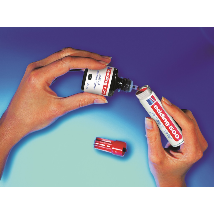 Atrament s kvapkovým dávkovačom na dopĺňanie permanentných popisovačov edding 2000 C, 2200 C, 400, 500, 550, 800, 850, 370 a 390. Pri dopĺňaní vložte prednú časť popisovača špičkou do fľaštičky a po niekoľkých minútach bude popisovač pripravený k opätovnému použitiu. Obsah 30 ml. Tento chemický prípravok je nebezpečný.