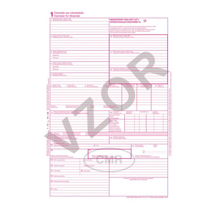 Evidenčné a colné tlačivá. CMR, 5 listov, balenie 100 súprav. Samoprepis.