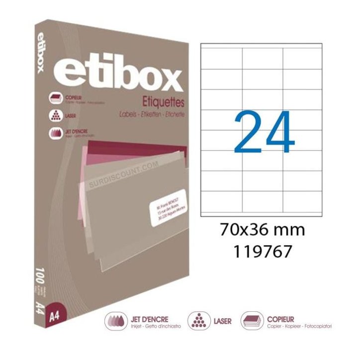 Cenovo výhodné etikety vhodné do laserových a atramentových tlačiarní, ako aj kopírovacích strojov. Rozmery: 70x36 mm Počet etikiet: 2400 Balenie: 100 hárkov