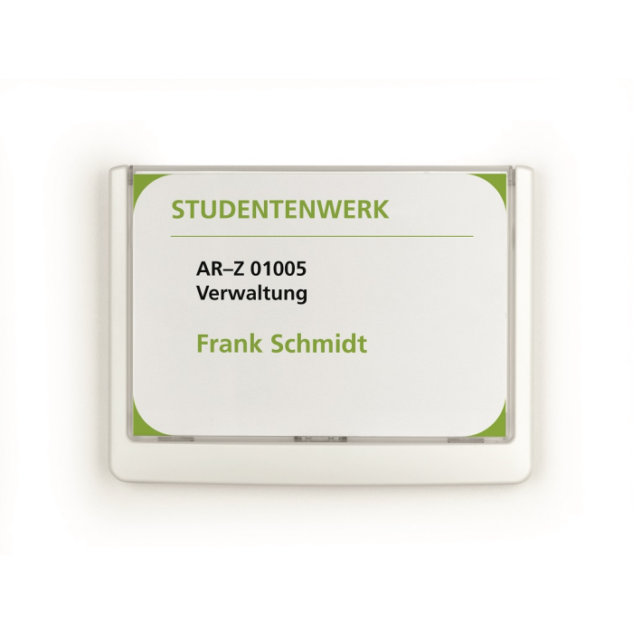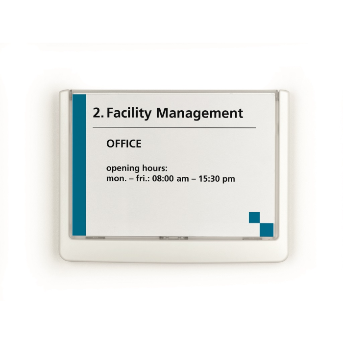 Moderná informačná tabuľka na dvere s lemom v atraktívnej bielej farbe. Predný panel sa otvára na jedno zatlačenie, a tým sa jednoducho sprístupnia vložené popisné papiere, ktoré sa môžu vymieňať podľa potrieb. Tabuľka je ideálna do kancelárií, úradov, škôl, univerzít a hotelov. Súčasťou balenia je montážna sada s názorným návodom. Namiesto pevného montovania môže byť tabuľka k povrchu aj prilepená.