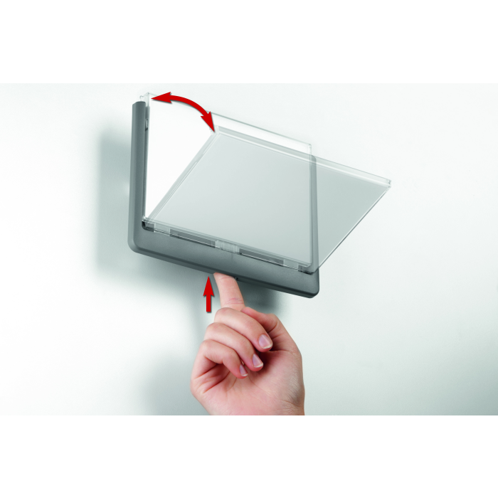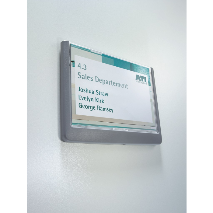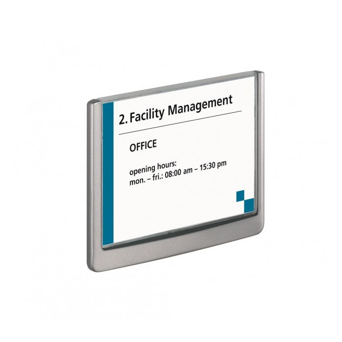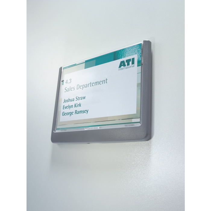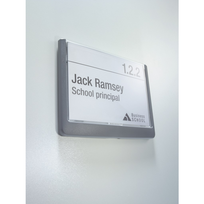 Moderná informačná tabuľka na dvere s lemom v atraktívnej grafitovej farbe. Predný panel sa otvára na jedno zatlačenie, a tým sa jednoducho sprístupnia vložené popisné papiere, ktoré sa môžu vymieňať podľa potrieb. Tabuľka je ideálna do kancelárií, úradov, škôl, univerzít a hotelov. Súčasťou balenia je montážna sada s názorným návodom. Namiesto pevného montovania môže byť tabuľka k povrchu aj prilepená.