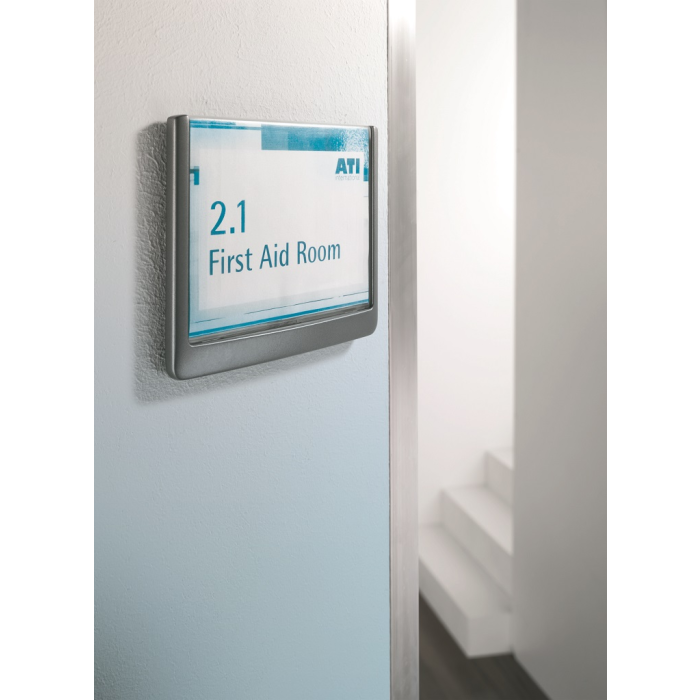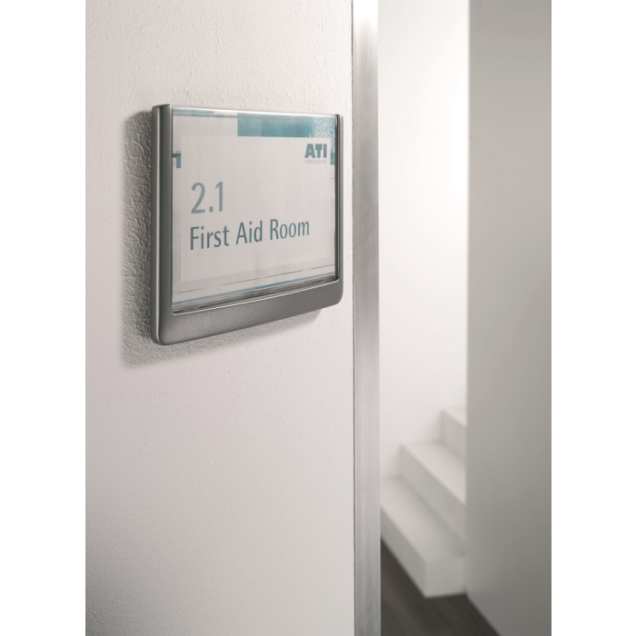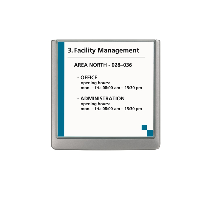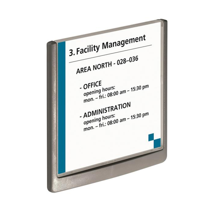 Moderná informačná tabuľka na dvere s lemom v atraktívnej grafitovej farbe. Predný panel sa otvára na jedno zatlačenie, a tým sa jednoducho sprístupnia vložené popisné papiere, ktoré sa môžu vymieňať podľa potrieb. Tabuľka je ideálna do kancelárií, úradov, škôl, univerzít a hotelov. Súčasťou balenia je montážna sada s názorným návodom. Namiesto pevného montovania môže byť tabuľka k povrchu aj prilepená.