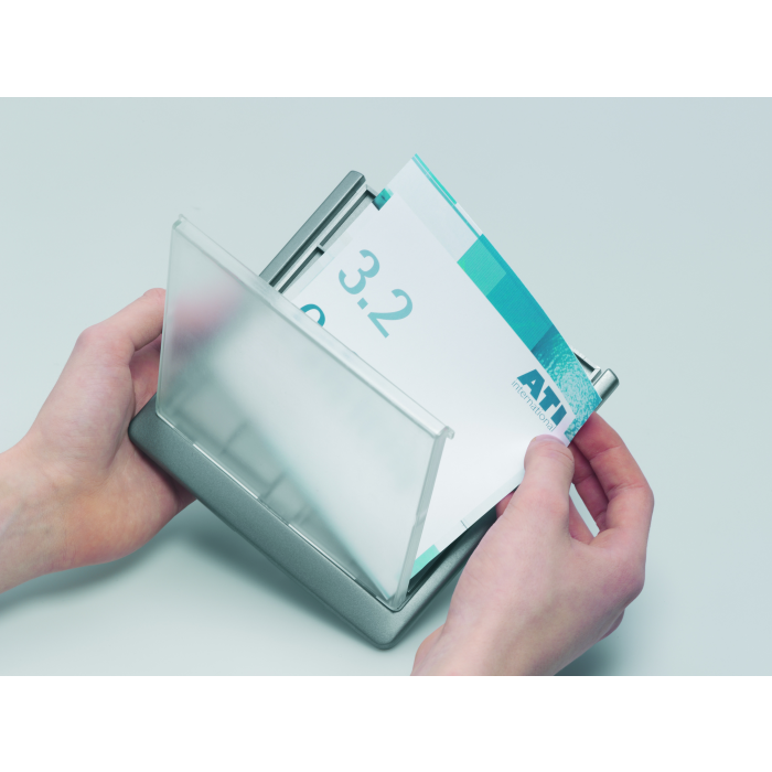 Moderná informačná tabuľka na dvere s lemom v atraktívnej grafitovej farbe. Predný panel sa otvára na jedno zatlačenie, a tým sa jednoducho sprístupnia vložené popisné papiere, ktoré sa môžu vymieňať podľa potrieb. Tabuľka je ideálna do kancelárií, úradov, škôl, univerzít a hotelov. Súčasťou balenia je montážna sada s názorným návodom. Namiesto pevného montovania môže byť tabuľka k povrchu aj prilepená.