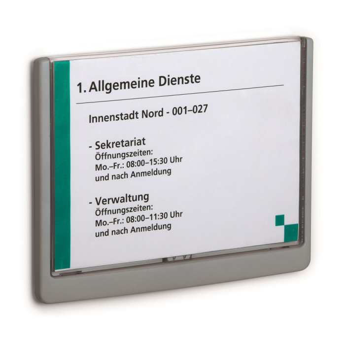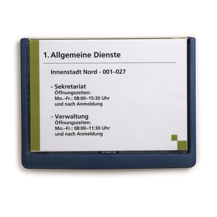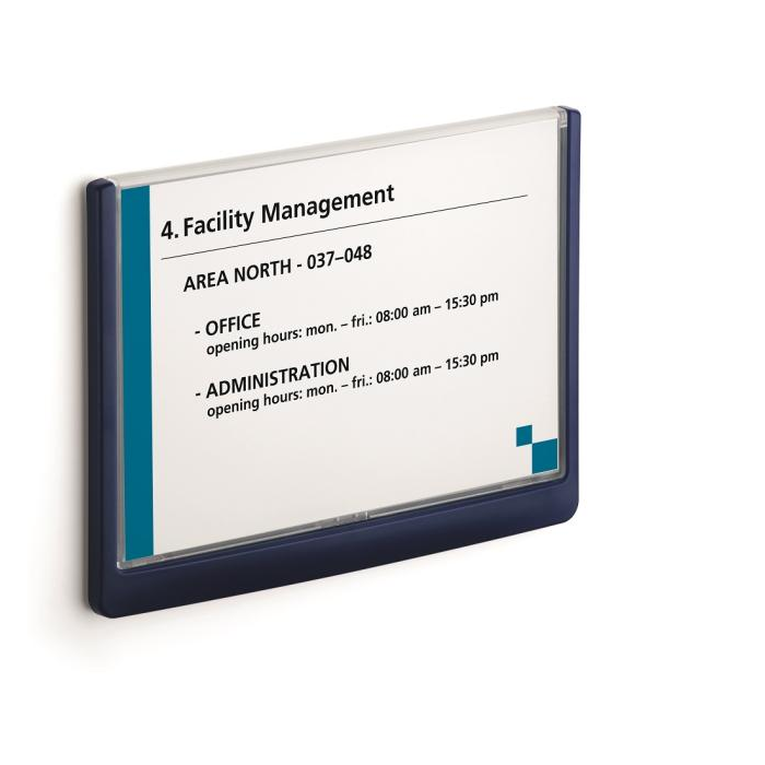 Moderná informačná tabuľka na dvere s lemom v atraktívnej modrej farbe. Predný panel sa otvára na jedno zatlačenie, a tým sa jednoducho sprístupnia vložené popisné papiere, ktoré sa môžu vymieňať podľa potrieb. Tabuľka je ideálna do kancelárií, úradov, škôl, univerzít a hotelov. Súčasťou balenia je montážna sada s názorným návodom. Namiesto pevného montovania môže byť tabuľka k povrchu aj prilepená.