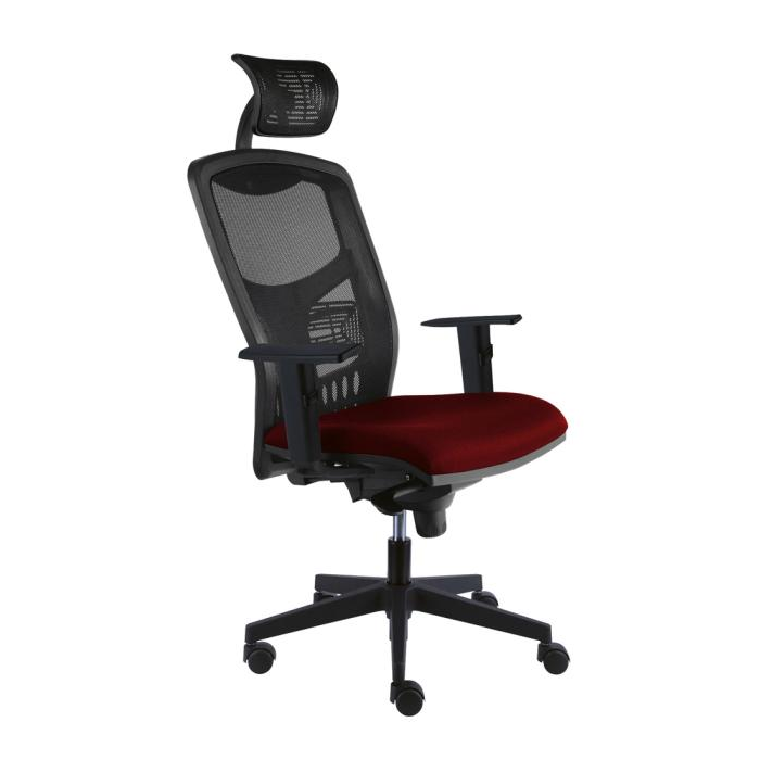 Moderná kancelárska stolička s vysokým fixným sieťovaným operadlom s výškovo nastaviteľnou bedrovou opierkou a s bohatým čalúnením sedadla.