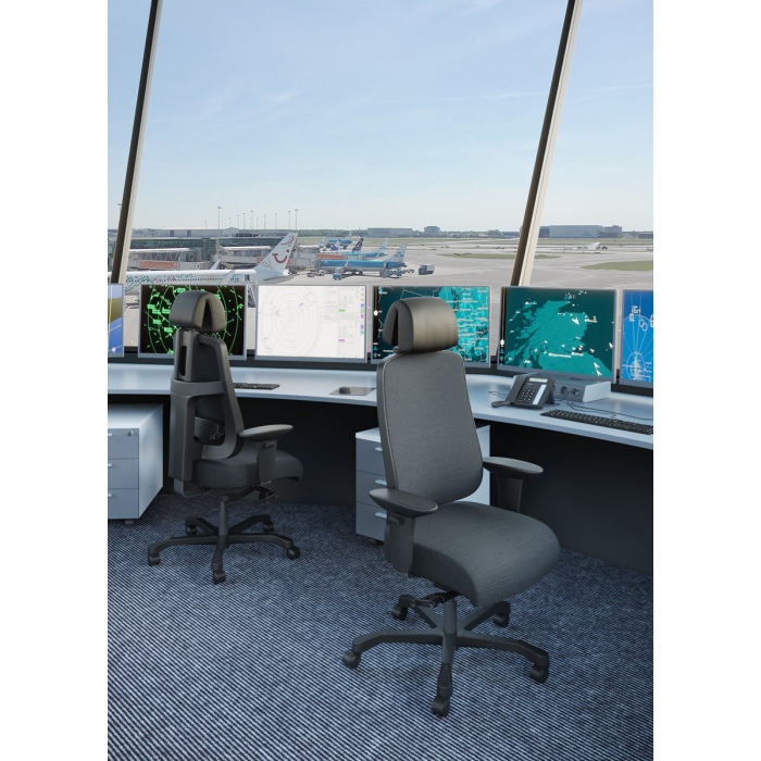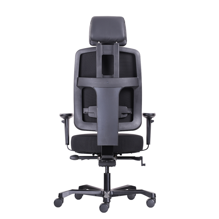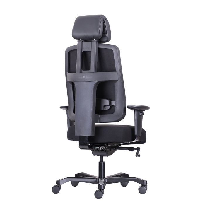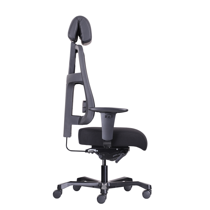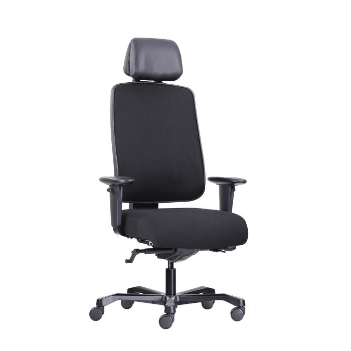 Kreslo špeciálne konštruované pre vysoké a ťažké postavy s aplikáciami 24/7 a nosnosťou 200 kg - intenzívne použitie, extra vysoké podporované operadlo potiahnuté látkou a opierkou hlavy čalúnená hovädzie usní pre jednoduchú údržbu.