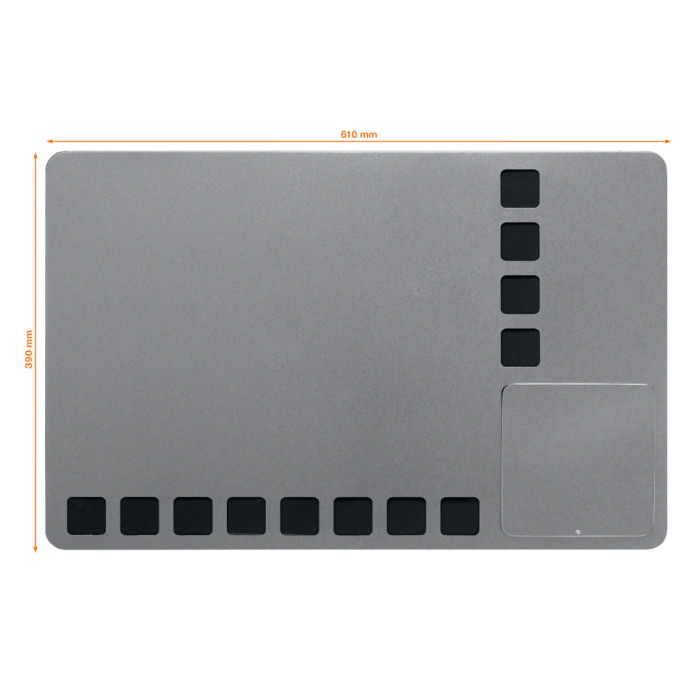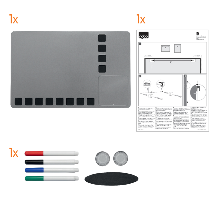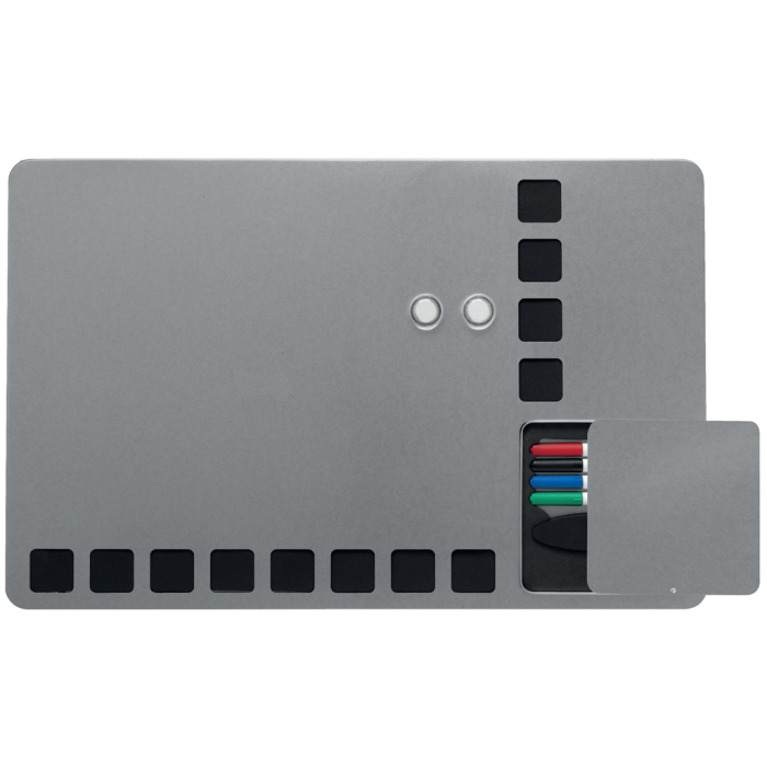 Kombinovaná tabuľa Rexel Combination Board s viacúčelovým a moderným bezrámčekovým dizajnom. Strieborný magnetický popisovací povrch s čiernymi penovými štvorcami pre upevnenie poznámok. Zabudovaný priestor pre uloženie 4 popisovačov a mazacej huby. Obsahuje štyri popisovače Rewritable (červený, modrý, čierny a zelený), montážne magnety a penovú lepiacu pásku. Veľkosť 610 × 390 mm.