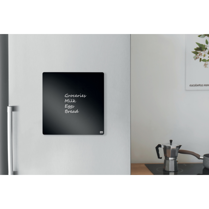 Kompaktné magnetické dielce stierateľné za sucha majú ideálnu veľkosť pre každý pracovný stôl, doma i v kancelárii. Obsahujú dva magnety, biely popisovač s mazacou hubou a montážnu penovú pásku. Farba: čierna. Rozmery 360 × 360 mm.