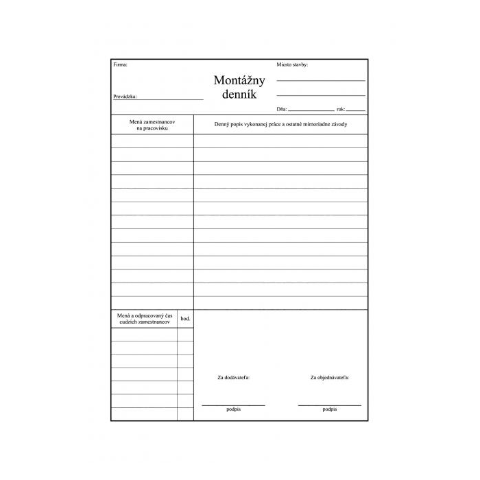 Stavebné tlačivo. Montážny denník, samoprepis, A4, kniha, 100 listov.