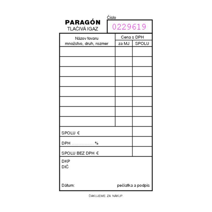 Paragón číslovaný, bez samoprepisu, A6, 100 listov