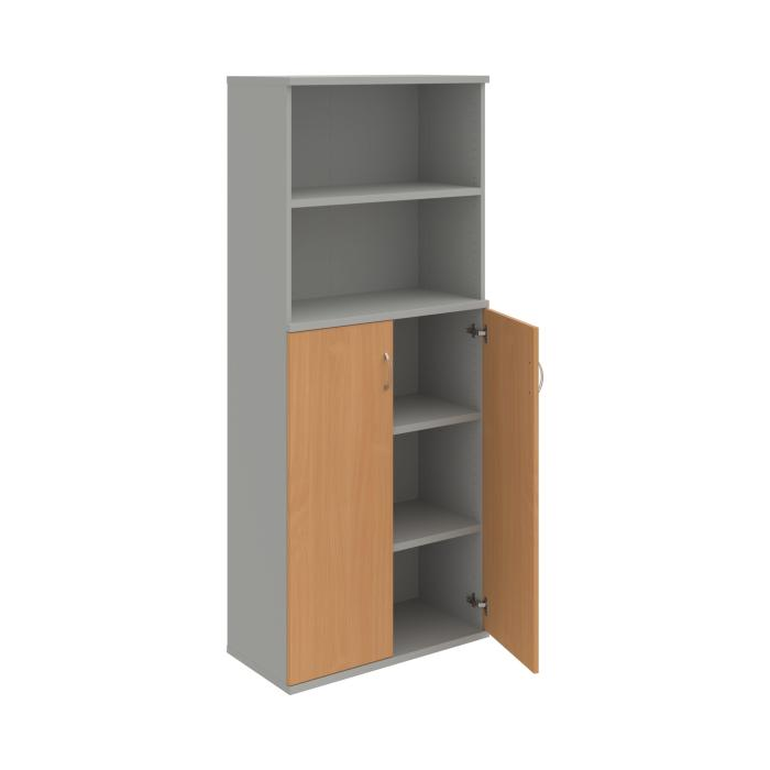 Kombinovaná skriňa - dvere/nika. Kancelárske skrine STRONG majú robustnú konštrukciu a vyššiu nosnosť políc ako bežné kancelárske skrine.V ponuke sú skriňové moduly s výškou 185 cm, 111 cm alebo 74 cm a šírky 80 cm alebo 40 cm.Hĺbka všetkých modelov skriňového radu STRONG je 40 cm.Chrbát, vyrobený z 8 mm hrubých dosák, je obojstranne pohľadový, takže skrine môžete použiť ako priestorový deliaci prvok. Hrúbka samotných políc je 25 mm, čo znamená nosnosť 80 kg na 1 policu.Korpusy, dvierka a police skríň sú olepené odolnou 2mm ABS hranou, ktorá garantuje dostatočnú ochranu proti poškodeniu.