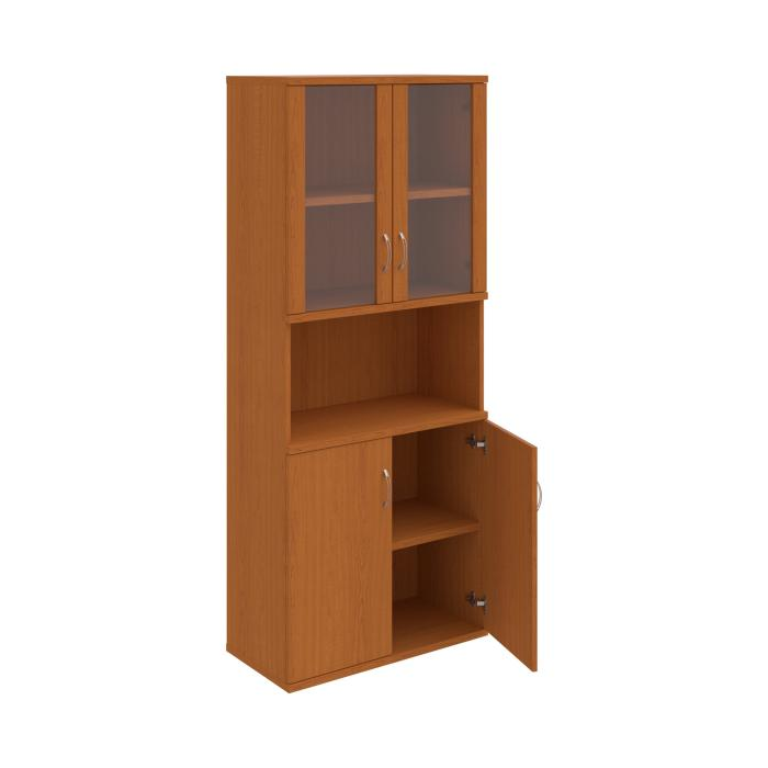 Kombinovaná skriňa - dvere/nika. Kancelárske skrine STRONG majú robustnú konštrukciu a vyššiu nosnosť políc ako bežné kancelárske skrine.V ponuke sú skriňové moduly s výškou 185 cm, 111 cm alebo 74 cm a šírky 80 cm alebo 40 cm. Hĺbka všetkých modelov skriňového radu STRONG je 40 cm.Chrbát, vyrobený z 8 mm hrubých dosák, je obojstranne pohľadový, takže skrine môžete použiť ako priestorový deliaci prvok. Hrúbka samotných políc je 25 mm, čo znamená nosnosť 80 kg na 1 policu.Korpusy, dvierka a police skríň sú olepené odolnou 2mm ABS hranou, ktorá garantuje dostatočnú ochranu proti poškodeniu.