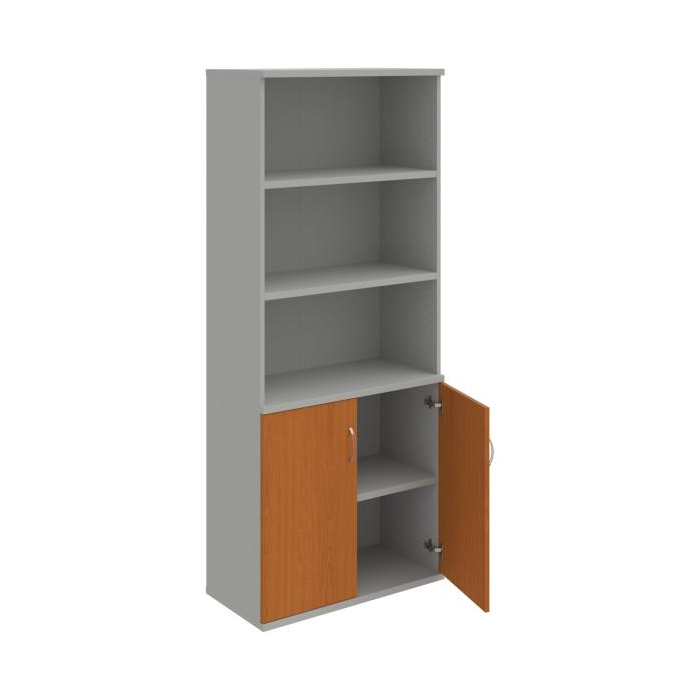 Kombinovaná skriňa - dvere/nika. Kancelárske skrine STRONG majú robustnú konštrukciu a vyššiu nosnosť políc ako bežné kancelárske skrine.V ponuke sú skriňové moduly s výškou 185 cm, 111 cm alebo 74 cm a šírky 80 cm alebo 40 cm.Hĺbka všetkých modelov skriňového radu STRONG je 40 cm.Chrbát, vyrobený z 8 mm hrubých dosák, je obojstranne pohľadový, takže skrine môžete použiť ako priestorový deliaci prvok. Hrúbka samotných políc je 25 mm, čo znamená nosnosť 80 kg na 1 policu.Korpusy, dvierka a police skríň sú olepené odolnou 2mm ABS hranou, ktorá garantuje dostatočnú ochranu proti poškodeniu.