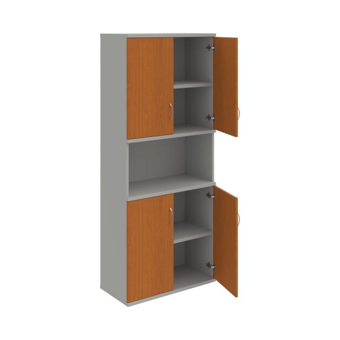 Kombinovaná skriňa - dvere/nika. Kancelárske skrine STRONG majú robustnú konštrukciu a vyššiu nosnosť políc ako bežné kancelárske skrine.V ponuke sú skriňové moduly s výškou 185 cm, 111 cm alebo 74 cm a šírky 80 cm alebo 40 cm.Hĺbka všetkých modelov skriňového radu STRONG je 40 cm.Chrbát, vyrobený z 8 mm hrubých dosák, je obojstranne pohľadový, takže skrine môžete použiť ako priestorový deliaci prvok. Hrúbka samotných políc je 25 mm, čo znamená nosnosť 80 kg na 1 policu.Korpusy, dvierka a police skríň sú olepené odolnou 2mm ABS hranou, ktorá garantuje dostatočnú ochranu proti poškodeniu.