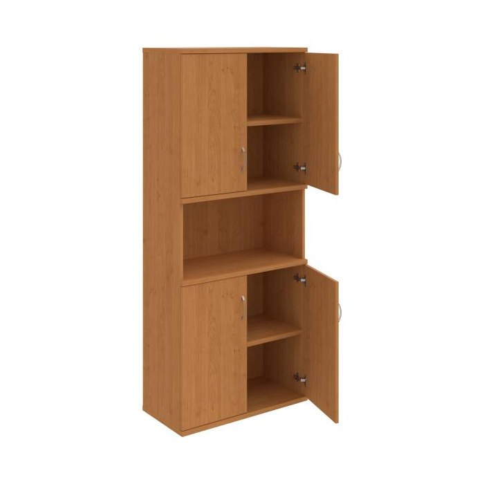 Kombinovaná skriňa - dvere/nika. Kancelárske skrine STRONG majú robustnú konštrukciu a vyššiu nosnosť políc ako bežné kancelárske skrine.V ponuke sú skriňové moduly s výškou 185 cm, 111 cm alebo 74 cm a šírky 80 cm alebo 40 cm.Hĺbka všetkých modelov skriňového radu STRONG je 40 cm.Chrbát, vyrobený z 8 mm hrubých dosák, je obojstranne pohľadový, takže skrine môžete použiť ako priestorový deliaci prvok. Hrúbka samotných políc je 25 mm, čo znamená nosnosť 80 kg na 1 policu.Korpusy, dvierka a police skríň sú olepené odolnou 2mm ABS hranou, ktorá garantuje dostatočnú ochranu proti poškodeniu.