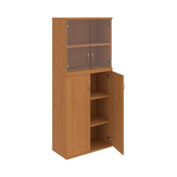 Kombinovaná skriňa - dvere/nika. Kancelárske skrine STRONG majú robustnú konštrukciu a vyššiu nosnosť políc ako bežné kancelárske skrine.V ponuke sú skriňové moduly s výškou 185 cm, 111 cm alebo 74 cm a šírky 80 cm alebo 40 cm. Hĺbka všetkých modelov skriňového radu STRONG je 40 cm.Chrbát, vyrobený z 8 mm hrubých dosák, je obojstranne pohľadový, takže skrine môžete použiť ako priestorový deliaci prvok. Hrúbka samotných políc je 25 mm, čo znamená nosnosť 80 kg na 1 policu.Korpusy, dvierka a police skríň sú olepené odolnou 2mm ABS hranou, ktorá garantuje dostatočnú ochranu proti poškodeniu.