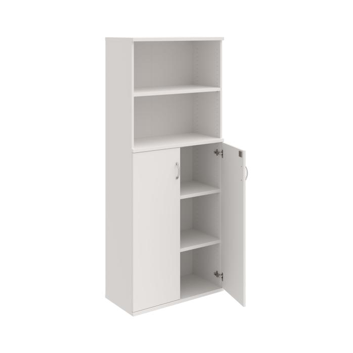 Kombinovaná skriňa - dvere/nika. Kancelárske skrine STRONG majú robustnú konštrukciu a vyššiu nosnosť políc ako bežné kancelárske skrine.V ponuke sú skriňové moduly s výškou 185 cm, 111 cm alebo 74 cm a šírky 80 cm alebo 40 cm.Hĺbka všetkých modelov skriňového radu STRONG je 40 cm.Chrbát, vyrobený z 8 mm hrubých dosák, je obojstranne pohľadový, takže skrine môžete použiť ako priestorový deliaci prvok. Hrúbka samotných políc je 25 mm, čo znamená nosnosť 80 kg na 1 policu.Korpusy, dvierka a police skríň sú olepené odolnou 2mm ABS hranou, ktorá garantuje dostatočnú ochranu proti poškodeniu.
