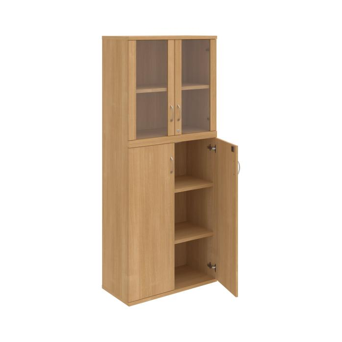 Kombinovaná skriňa - dvere/nika. Kancelárske skrine STRONG majú robustnú konštrukciu a vyššiu nosnosť políc ako bežné kancelárske skrine.V ponuke sú skriňové moduly s výškou 185 cm, 111 cm alebo 74 cm a šírky 80 cm alebo 40 cm. Hĺbka všetkých modelov skriňového radu STRONG je 40 cm.Chrbát, vyrobený z 8 mm hrubých dosák, je obojstranne pohľadový, takže skrine môžete použiť ako priestorový deliaci prvok. Hrúbka samotných políc je 25 mm, čo znamená nosnosť 80 kg na 1 policu.Korpusy, dvierka a police skríň sú olepené odolnou 2mm ABS hranou, ktorá garantuje dostatočnú ochranu proti poškodeniu.