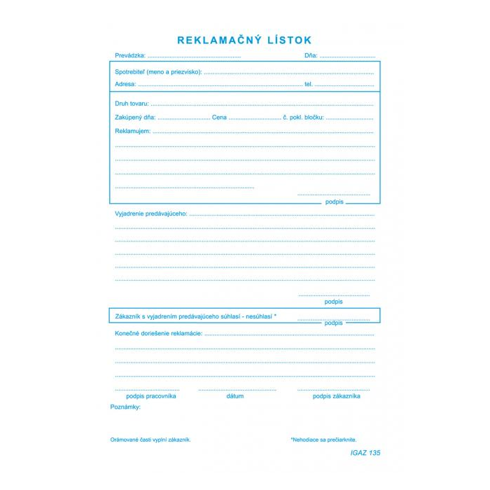 Reklamačný list, samoprepis, A5, blok, 100 listov.