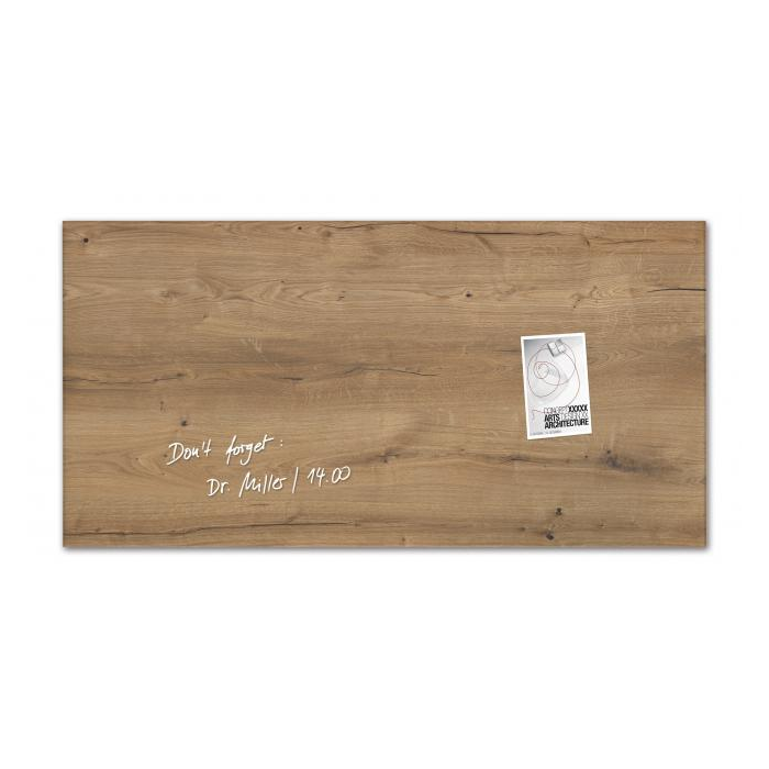 Magnetické tabule z tepelne tvrdeného bezpečnostného skla (EN 12150-1) hrúbky 15 mm s jednoduchou a bezpečnou montážou s certifi kátom TUV dodajú vašim kanceláriám, konferenčným miestnostiam, jedálňam i domácnostiam exkluzívny vzhľad. Sú popisovateľné kriedovými popisovačmi Sigel a za sucha zotierateľné utierkou z mikrovákna. Súčasťou balenia sú 3 super silné neodymové magnety a montážny materiál. Pri používaní príslušenstva Sigel je garantovaná 25-ročná záruka na magnetický sklenený povrch tabule. Rozmery 91 × 46 cm. Dizajn prírodné drevo.