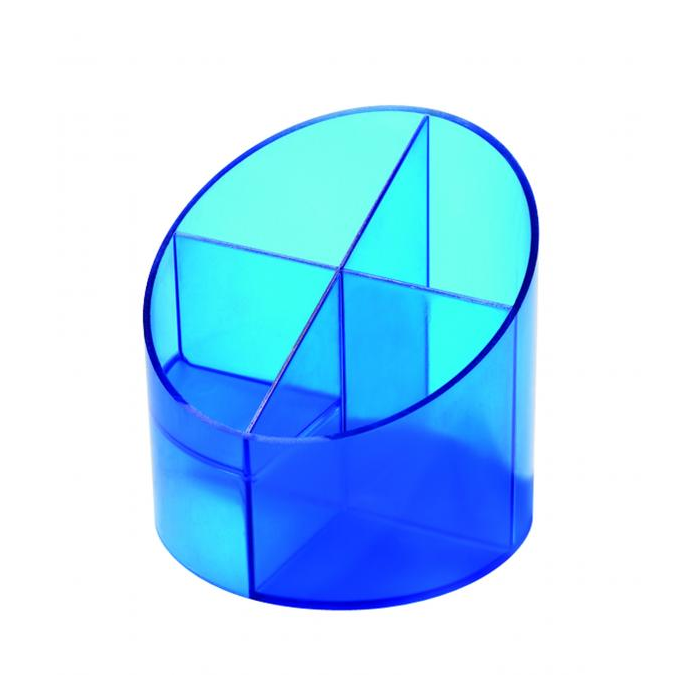 Stojan so štyrmi oddielmi na perá, ceruzky a kancelárske drobnosti z plastu v ekonomickom prevedení. Výška 105 mm, priemer 110 mm. Farba priehľadná modrá.