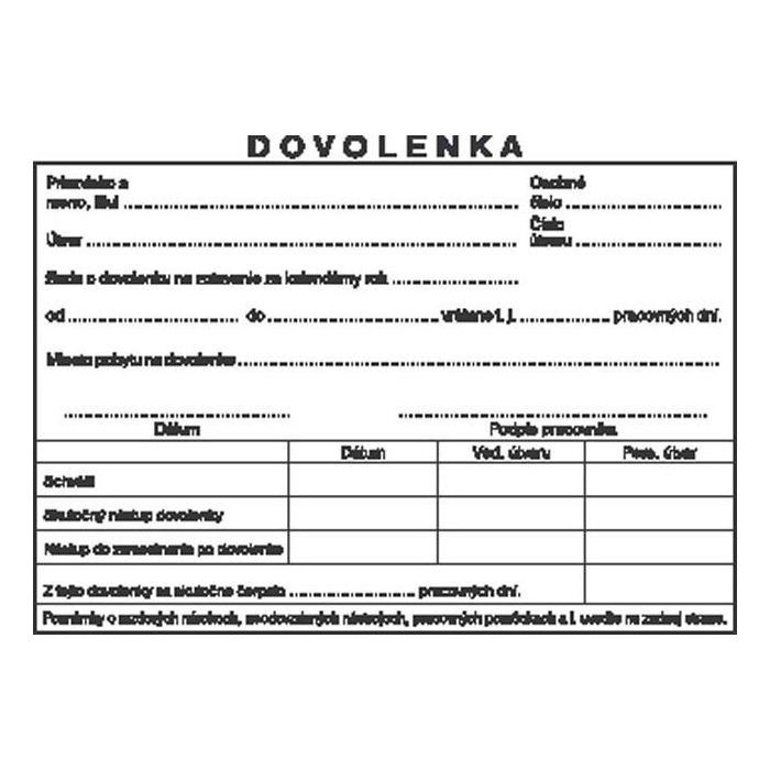 Tlačivo Dovolenka, A6, samoprepis, blok 100 listov.