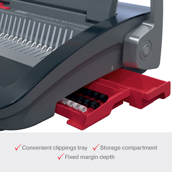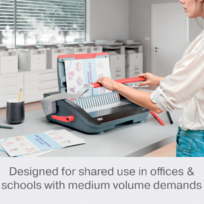 • spoľahlivý a kompaktný ručný viazač s plastovými chrbtami, navrhnutý na zdieľané použitie v kancelárskom a školskom prostredí s bežnými nárokmi na objem väzby