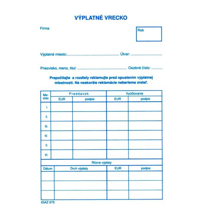 Tlačivo : Výplatné vrecko formát C6.