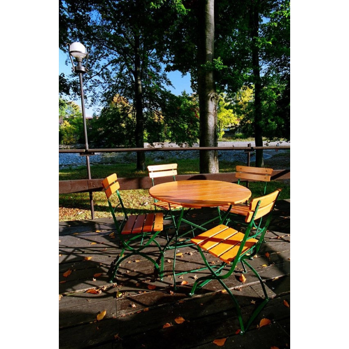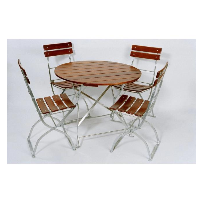 Stoličky a stôl sú skladacie a drevo je ku kovovému skeletu priskrutkované pozinkovanými vratovými skrutkami.